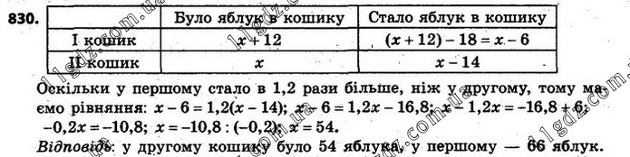 830. У першому кошику було на 12 яблук більше, ніж у другому. Після того як мама взяла з першого кошика 18 яблук, а з другого 14, у першому кошику яблук стало в 1,2 разу більше, ніж у другому. Скільки яблук було в кожному кошику спочатку?