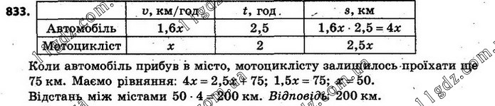 833. З міста А до міста В одночасно виїхали автомобіль і мотоцикліст. Коли через 2,5 год автомобіль прибув до міста В, мотоциклістові до цього міста залишалося проїхати ще 75 км. Знайдіть відстань між містами, як-що швидкість автомобіля в 1,6 разу більша від швидкості мотоцикліста.