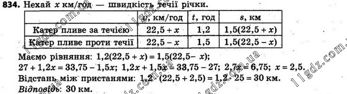 834. Човен проплив шлях між двома пристанями за течією річки за 1,2 год, а на зворотний шлях затратив 1,5 год. Знайдіть відстань між пристанями, якщо швидкість човна у стоячій воді дорівнює 22,5 км/год.