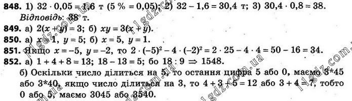 У процесі очищення руди кількість домішок у ній зменшується від 20%у добутій руді до 5% в очищеній. Скільки потрібно взяти тонн добутої руди, щоб одержати 32 т очищеної? 849. Запишіть відповідні рівності: а) подвоєна сума чисел х та у дорівнює 3; б) добуток чисел х та у утричі більший від їх суми. 850. Доберіть такі два числа х та у, для яких виконується рівність: а) 2х + 5у = 27; б) 3х – 7у = 8. 851. Знайдіть значення виразу 2x2 – 4y2, якщо х дорівнює найменшому ціло-му числу, яке задовольняє нерівність –5,4 < x < –2,7, а y — найбільшому цілому числу, яке задовольняє нерівність –15,4 ≤ у ≤ –2. 852. Поставте замість зірочок такі цифри, щоб число: ) 1*48 ділилося на 9; б) 3*4* ділилося на 3 і на 5.