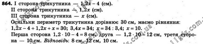 864. Периметр трикутника дорівнює 30 см. Знайдіть довжину кожної сторо-ни трикутника, якщо перша його сторона на 4 см коротша від другої, а друга — в 1,2 разу довша від третьої.