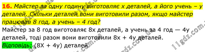 Майстер за одну годину виготовляє х деталей, а його учень – у деталей. Скільки деталей вони виготовили разом, якщо майстер працював 8 год, а учень – 4 год? Майстер за 8 год виготовляє 8х деталей, а учень за 4 год — 4у деталей, тоді разом вони виготовили 8х + 4у деталей. Відповідь: (8X + 4у) деталей.