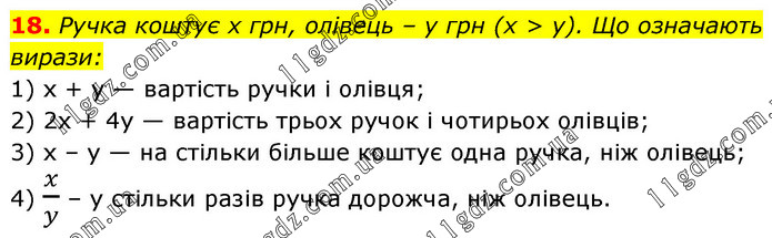 Ручка коштує х грн, олівець – у грн (x > у). Що означають вирази: 1) х + у — вартість ручки і олівця; 2) 2х + 4у — вартість трьох ручок і чотирьох олівців; 3) х – у — на стільки більше коштує одна ручка, ніж олівець; 4) x/y – у стільки разів ручка дорожча, ніж олівець.