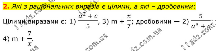 Які з раціональних виразів є цілими, а які – дробовими: Цілими виразами є: 1) (a^2 + c)/5, 3) m + x/7; дробовими — 2) 5/(a^3 + c); 4) m + 7/x.