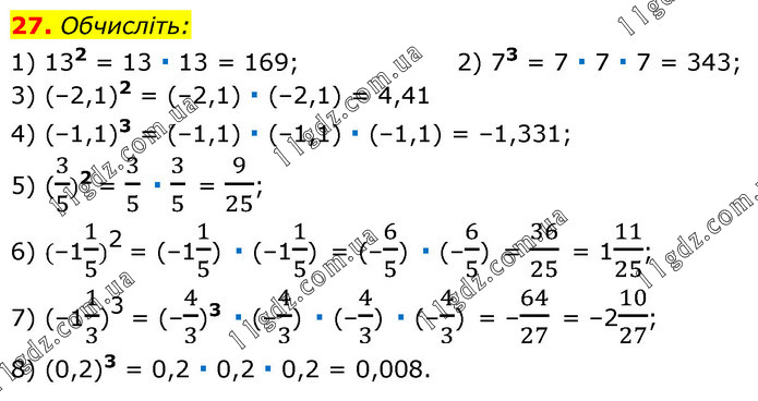 Обчисліть: 1) 132 = 13 ∙ 13 = 169; 2) 73 = 7 ∙ 7 ∙ 7 = 343; 3) (–2,1)2 = (–2,1) ∙ (–2,1) = 4,41 4) (–1,1)3 = (–1,1) ∙ (–1,1) ∙ (–1,1) = –1,331; 5) (3/5)2 = 3/5 ∙ 3/5 = 9/25; 6) (–11/5)2 = (–11/5) ∙ (–11/5) = (–6/5) ∙ (–6/5) = 36/25 = 111/25; 7) (–11/3)3 = (–4/3)3 ∙ (–4/3) ∙ (–4/3) ∙ (–4/3) = –64/27 = –210/27; 8) (0,2)3 = 0,2 ∙ 0,2 ∙ 0,2 = 0,008.