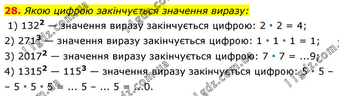 Якою цифрою закінчується значення виразу: 1) 1322 — значення виразу закінчується цифрою: 2 ∙ 2 = 4; 2) 2713 — значення виразу закінчується цифрою: 1 ∙ 1 ∙ 1 = 1; 3) 20172 — значення виразу закінчується цифрою: 7 ∙ 7 = ...9; 4) 13152 — 1153 — значення виразу закінчується цифрою: 5 ∙ 5 – – 5 ∙ 5 ∙ 5 = ... 5 – ... 5 = ...0.