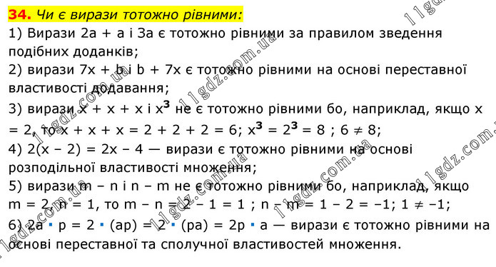 Чи є вирази тотожно рівними: 1) Вирази 2а + а і За є тотожно рівними за правилом зведення подібних доданків; 2) вирази 7x + b і b + 7x є тотожно рівними на основі переставної властивості додавання; 3) вирази х + х + х і x3 не є тотожно рівними бо, наприклад, якщо х = 2, то х + х + х = 2 + 2 + 2 = 6; x3 = 23 = 8 ; 6 ≠ 8; 4) 2(х – 2) = 2х – 4 — вирази є тотожно рівними на основі розподільної властивості множення; 5) вирази m – n і n – m не є тотожно рівними бо, наприклад, якщо m = 2, n = 1, то m – n = 2 – 1 = 1 ; n – m = 1 – 2 = –1; 1 ≠ –1; 6) 2а ∙ р = 2 ∙ (ар) = 2 ∙ (ра) = 2р ∙ а — вирази є тотожно рівними на основі переставної та сполучної властивостей множення.