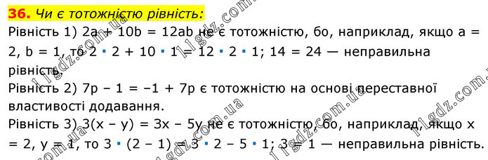 Чи є тотожністю рівність: Рівність 1) 2а + 10b = 12аb не є тотожністю, бо, наприклад, якщо а = 2, b = 1, то 2 ∙ 2 + 10 ∙ 1 = 12 ∙ 2 ∙ 1; 14 = 24 — неправильна рівність. Рівність 2) 7p – 1 = –1 + 7p є тотожністю на основі переставної властивості додавання. Рівність 3) 3(х – у) = Зх – 5у не є тотожністю, бо, наприклад, якщо х = 2, у = 1, то 3 ∙ (2 – 1) = 3 ∙ 2 – 5 ∙ 1; 3 = 1 — неправильна рівність.
