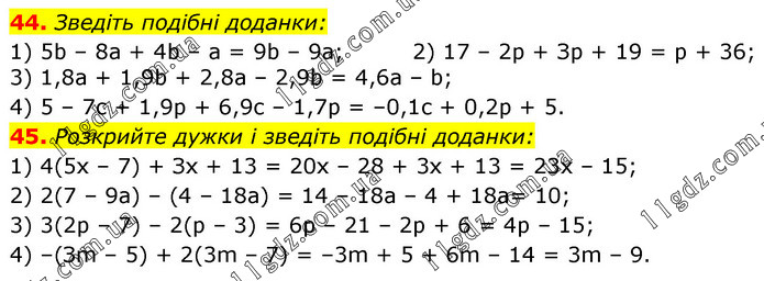 44. Зведіть подібні доданки: 1) 5b – 8а + 4b – а = 9b – 9а; 2) 17 – 2р + Зр + 19 = p + 36; 3) 1,8а + 1,9b + 2,8а – 2,9b = 4,6а – b; 4) 5 – 7с + 1,9р + 6,9с – 1,7р = –0,1с + 0,2p + 5. 45. Розкрийте дужки і зведіть подібні доданки: 1) 4(5х – 7) + Зх + 13 = 20х – 28 + 3x + 13 = 23х – 15; 2) 2(7 – 9а) – (4 – 18а) = 14 – 18а – 4 + 18а= 10; 3) 3(2р – 7) – 2(р – 3) = 6р – 21 – 2р + 6 = 4р – 15; 4) –(Зm – 5) + 2(3m – 7) = –3m + 5 + 6m – 14 = 3m – 9.