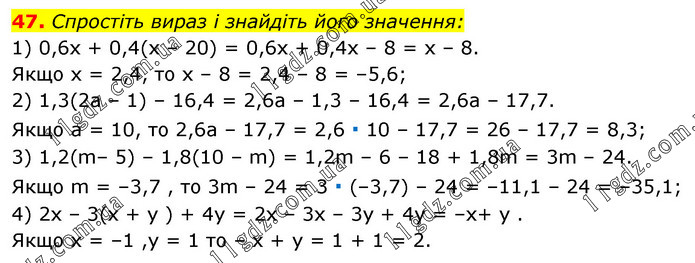 Спростіть вираз і знайдіть його значення: 1) 0,6x + 0,4(х – 20) = 0,6x + 0,4х – 8 = х – 8. Якщо х = 2,4, то х – 8 = 2,4 – 8 = –5,6; 2) 1,3(2а – 1) – 16,4 = 2,6а – 1,3 – 16,4 = 2,6а – 17,7. Якщо а = 10, то 2,6а – 17,7 = 2,6 ∙ 10 – 17,7 = 26 – 17,7 = 8,3; 3) 1,2(m– 5) – 1,8(10 – m) = 1,2m – 6 – 18 + 1,8m = 3m – 24. Якщо m = –3,7 , то 3m – 24 = 3 ∙ (–3,7) – 24 = –11,1 – 24 = –35,1; 4) 2х – 3(х + у ) + 4у = 2х – 3х – 3у + 4у = –х+ у . Якщо х = –1 ,у = 1 то – x + y = 1 + 1 = 2.