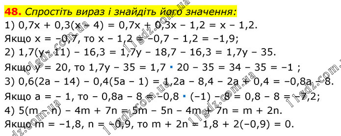 Спростіть вираз і знайдіть його значення: 1) 0,7x + 0,3(х – 4) = 0,7x + 0,3x – 1,2 = х – 1,2. Якщо х = –0,7, то х – 1,2 = –0,7 – 1,2 = –1,9; 2) 1,7(у– 11) – 16,3 = 1,7у – 18,7 – 16,3 = 1,7у – 35. Якщо y = 20, то 1,7y – 35 = 1,7 ∙ 20 – 35 = 34 – 35 = –1 ; 3) 0,6(2а – 14) – 0,4(5а – 1) = 1,2а – 8,4 – 2а + 0,4 = –0,8а – 8. Якщо а = – 1, то – 0,8а – 8 = –0,8 ∙ (–1) – 8 = 0,8 – 8 = –7,2; 4) 5(m – n) – 4m + 7n = 5m – 5n – 4m + 7n = m + 2n. Якщо m = –1,8, n = –0,9, то m + 2n = 1,8 + 2(–0,9) = 0.