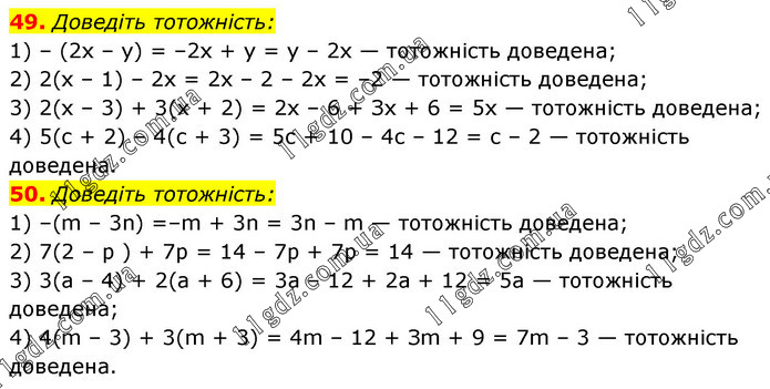 49. Доведіть тотожність: 1) – (2х – у) = –2х + у = у – 2х — тотожність доведена; 2) 2(х – 1) – 2х = 2х – 2 – 2х = –2 — тотожність доведена; 3) 2(х – 3) + 3(х + 2) = 2х – 6 + Зх + 6 = 5х — тотожність доведена; 4) 5(с + 2) – 4(с + 3) = 5с + 10 – 4с – 12 = с – 2 — тотожність доведена. 50. Доведіть тотожність: 1) –(m – 3n) =–m + 3n = 3n – m — тотожність доведена; 2) 7(2 – р ) + 7p = 14 – 7p + 7p = 14 — тотожність доведена; 3) 3(а – 4) + 2(а + 6) = 3а – 12 + 2а + 12 = 5а — тотожність доведена; 4) 4(m – 3) + 3(m + 3) = 4m – 12 + Зm + 9 = 7m – 3 — тотожність доведена.