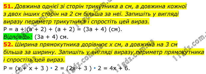 51. Довжина однієї зі сторін трикутника а см, а довжина кожної з двох інших сторін на 2 см більша за неї. Запишіть у вигляді виразу периметр трикутника і спростіть цей вираз. P = а + (а + 2) + (а + 2) = (3а + 4) (см). Відповідь: (3а + 4) см. 52. Ширина прямокутника дорівнює х см, а довжина на 3 см більша за ширину. Запишіть у вигляді виразу периметр прямокутника і спростіть цей вираз. Р = (х + х + 3 ) ∙ 2 = (2х + 3 ) ∙ 2 = 4x + 6.