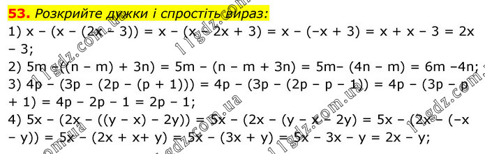 Розкрийте дужки і спростіть вираз: 1) х – (х – (2х – 3)) = х – (х – 2х + 3) = х – (–х + 3) = х + х – 3 = 2х – 3; 2) 5m –((n – m) + 3n) = 5m – (n – m + Зn) = 5m– (4n – m) = 6m –4n; 3) 4р – (Зр – (2р – (р + 1))) = 4р – (Зр – (2р – р – 1)) = 4р – (3р – р + 1) = 4р – 2р – 1 = 2р – 1; 4) 5х – (2х – ((у – х) – 2у)) = 5х – (2х – (у – х – 2у) = 5х – (2х – (–х – у)) = 5x – (2х + х+ у) = 5х – (3х + у) = 5x – 3х – у = 2х – у;