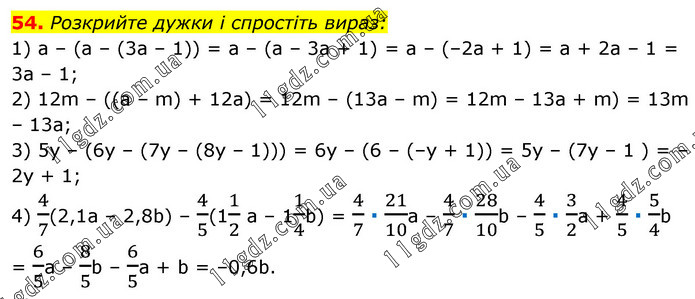 Розкрийте дужки і спростіть вираз: 1) а – (а – (3а – 1)) = а – (а – 3а + 1) = а – (–2а + 1) = а + 2а – 1 = 3а – 1; 2) 12m – ((а – m) + 12а) = 12m – (13а – m) = 12m – 13а + m) = 13m – 13а; 3) 5у – (6у – (7у – (8у – 1))) = 6y – (6 – (–у + 1)) = 5у – (7y – 1 ) = –2у + 1; 4) 4/7(2,1a – 2,8b) – 4/5(11/2 a – 11/4b) = 4/7 ∙ 21/10a – 4/7 ∙ 28/10b – 4/5 ∙ 3/2a + 4/5 ∙ 5/4b = 6/5a – 8/5b – 6/5a + b = –0,6b.