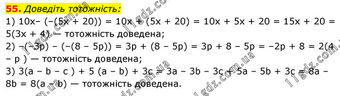 Доведіть тотожність: 1) 10x– (–(5x + 20)) = 10x + (5x + 20) = 10x + 5х + 20 = 15х + 20 = 5(3х + 4) — тотожність доведена; 2) –(–Зр) – (–(8 – 5р)) = 3р + (8 – 5р) = 3p + 8 – 5p = –2p + 8 = 2(4 – р ) — тотожність доведена; 3) 3(а – b – с ) + 5 (а – b) + 3с = 3а – 3b – 3с + 5а – 5b + 3с = 8а – 8b = 8(а – b) — тотожність доведена.