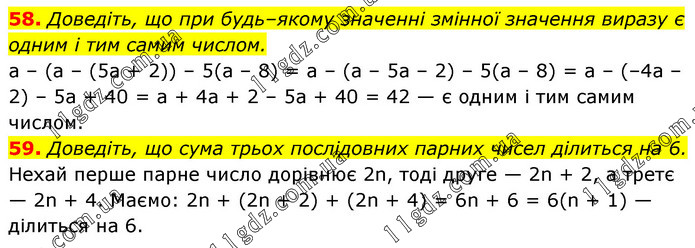 58. Доведіть, що при будь–якому значенні змінної значення виразу є одним і тим самим числом. а – (а – (5а + 2)) – 5(а – 8) = а – (а – 5а – 2) – 5(а – 8) = а – (–4а – 2) – 5а + 40 = а + 4а + 2 – 5а + 40 = 42 — є одним і тим самим числом. 59. Доведіть, що сума трьох послідовних парних чисел ділиться на 6. Нехай перше парне число дорівнює 2n, тоді друге — 2n + 2, а третє — 2n + 4. Маємо: 2n + (2n + 2) + (2n + 4) = 6n + 6 = 6(n + 1) — ділиться на 6.