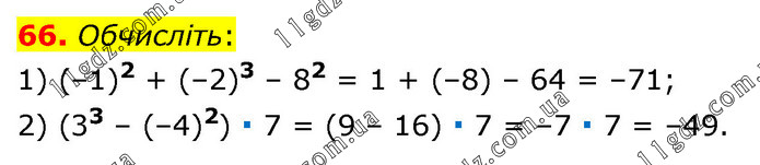 Обчисліть: 1) (–1)2 + (–2)3 – 82 = 1 + (–8) – 64 = –71; 2) (33 – (–4)2) ∙ 7 = (9 – 16) ∙ 7 = –7 ∙ 7 = –49.