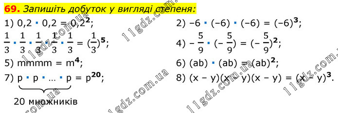 Запишіть добуток у вигляді степеня: 1) 0,2 ∙ 0,2 = 0,22; 2) –6 ∙ (–6) ∙ (–6) = (–6)3; 1/3 ∙ 1/3 ∙ 1/3 ∙ 1/3 ∙ 1/3 = (1/3)5; 4) – 5/9 ∙ (– 5/9) = (– 5/9)2; 5) mmmm = m4; 6) (ab) ∙ (ab) = (ab)2; 7) p ∙ p ∙ … ∙ p = p20; 20 множників 8) (x – y)(x – y)(x – y) = (x – y)3.