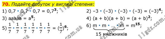 Подайте добуток у вигляді степеня: 1) 0,7 ∙ 0,7 ∙ 0,7 = 0,73; 2) –3 ∙ (–3) ∙ (–3) ∙ (–3) = (–3)4; 3) aaaaa = a5; 4) (a + b)(a + b) = (a + b)2; 5) 1/7 ∙ 1/7 ∙ 1/7 ∙ 1/7 ∙ 1/7 ∙ 1/7 = (1/7)6; 6) m ∙ m ∙ … ∙ m = m15; 15 множників