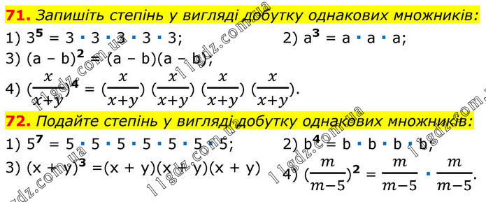 71. Запишіть степінь у вигляді добутку однакових множників: 1) 35 = 3 ∙ 3 ∙ 3 ∙ 3 ∙ 3; 2) a3 = a ∙ a ∙ a; 3) (a – b)2 = (a – b)(a – b); 4) (x/(x+y))4 = (x/(x+y)) (x/(x+y)) (x/(x+y)) (x/(x+y)). 72. Подайте степінь у вигляді добутку однакових множників: 1) 57 = 5 ∙ 5 ∙ 5 ∙ 5 ∙ 5 ∙ 5 ∙ 5; 2) b4 = b ∙ b ∙ b ∙ b; 3) (x + y)3 =(x + y)(x + y)(x + y) 4) (m/(m-5))2 = m/(m-5) ∙ m/(m-5).