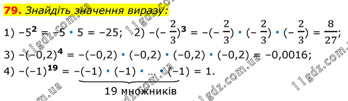 Знайдіть значення виразу: 1) –52 = –5 ∙ 5 = –25; 2) –(– 2/3)3 = –(– 2/3) ∙ (– 2/3) ∙ (– 2/3) = 8/27; 3) –(–0,2)4 = –(–0,2) ∙ (–0,2) ∙ (–0,2) ∙ (–0,2) = –0,0016; 4) –(–1)19 = –(–1) ∙ (–1) ∙ … ∙ (–1) = 1.