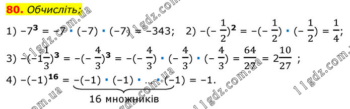 Обчисліть: 1) –73 = –7 ∙ (–7) ∙ (–7) = –343; 2) –(– 1/2)2 = –(– 1/2) ∙ (– 1/2) = 1/4; 3) –(–11/3)3 = –(– 4/3)3 = –(– 4/3) ∙ (– 4/3) ∙ (– 4/3) = 64/27 = 210/27 ; 4) –(–1)16 = –(–1) ∙ (–1) ∙ … ∙ (–1) = –1.