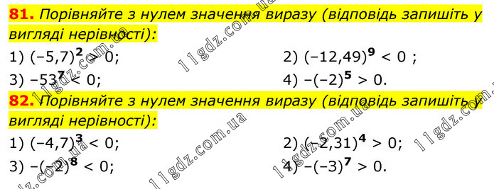 81. Порівняйте з нулем значення виразу (відповідь запишіть у вигляді нерівності): 1) (–5,7)2 > 0; 3) –537 < 0; 2) (–12,49)9 < 0 ; 4) –(–2)5 > 0. 82. Порівняйте з нулем значення виразу (відповідь запишіть у вигляді нерівності): 1) (–4,7)3 < 0; 3) –(–2)8 < 0; 2) (–2,31)4 > 0; 4) –(–З)7 > 0.
