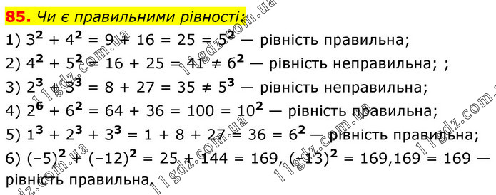 Чи є правильними рівності: 1) З2 + 42 = 9 + 16 = 25 = 52 — рівність правильна; 2) 42 + 52 = 16 + 25 = 41 ≠ б2 — рівність неправильна; ; 3) 23 + З3 = 8 + 27 = 35 ≠ 53 — рівність неправильна; 4) 26 + 62 = 64 + 36 = 100 = 102 — рівність правильна; 5) 13 + 23 + З3 = 1 + 8 + 27 = 36 = 62 — рівність правильна; 6) (–5)2 + (–12)2 = 25 + 144 = 169, (–13)2 = 169,169 = 169 — рівність правильна.