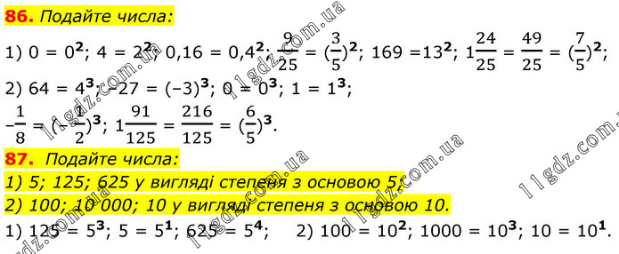 86. Подайте числа: 1) 0 = 02; 4 = 22; 0,16 = 0,42; 9/25 = (3/5)2; 169 =132; 124/25 = 49/25 = (7/5)2; 2) 64 = 43; –27 = (–3)3; 0 = 03; 1 = 13; –1/8 = (– 1/2)3; 191/125 = 216/125 = (6/5)3. 87. Подайте числа: 1) 5; 125; 625 у вигляді степеня з основою 5; 2) 100; 10 000; 10 у вигляді степеня з основою 10. 1) 125 = 53; 5 = 51; 625 = 54; 2) 100 = 102; 1000 = 103; 10 = 101.