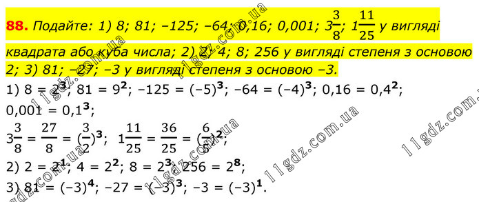 Подайте: 1) 8; 81; –125; –64; 0,16; 0,001; 33/8; 111/25 у вигляді квадрата або куба числа; 2) 2; 4; 8; 256 у вигляді степеня з основою 2; 3) 81; –27; –3 у вигляді степеня з основою –3. 1) 8 = 23; 81 = 92; –125 = (–5)3; –64 = (–4)3; 0,16 = 0,42; 0,001 = 0,13; 33/8 = 27/8 = (3/2)3; 111/25 = 36/25 = (6/5)2; 2) 2 = 21; 4 = 22; 8 = 23; 256 = 28; 3) 81 = (–3)4; –27 = (–3)3; –3 = (–3)1.