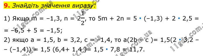 Знайдіть значення виразу: 1) Якщо m = –1,3, n = 21/2, то 5m + 2n = 5 ∙ (–1,3) + 2 ∙ 2,5 = = –6,5 + 5 = –1,5; 2) якщо а = 1,5, b = 3,2, с = –1,4, то а(2b – с )= 1,5(2 ∙ 3,2 – – (–1,4)) = 1,5 (6,4+ 1,4 )= 1,5 ∙ 7,8 = 11,7.