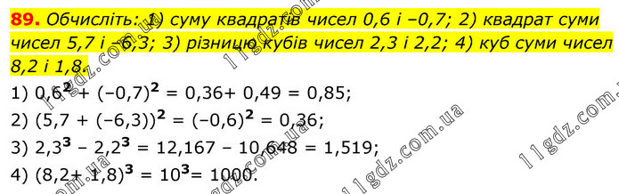 Обчисліть: 1) суму квадратів чисел 0,6 і –0,7; 2) квадрат суми чисел 5,7 і –6,3; 3) різницю кубів чисел 2,3 і 2,2; 4) куб суми чисел 8,2 і 1,8. 1) 0,62 + (–0,7)2 = 0,36+ 0,49 = 0,85; 2) (5,7 + (–6,3))2 = (–0,6)2 = 0,36; 3) 2,33 – 2,23 = 12,167 – 10,648 = 1,519; 4) (8,2+ 1,8)3 = 103= 1000.