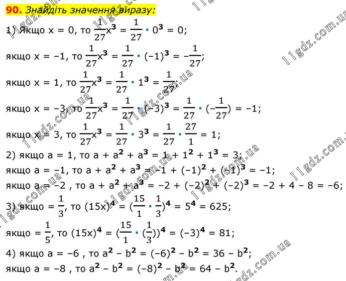 Знайдіть значення виразу: 1) Якщо х = 0, то 1/27х3 = 1/27 ∙ 03 = 0; якщо х = –1, то 1/27х3 = 1/27 ∙ (–1)3 = –1/27; якщо х = 1, то 1/27х3 = 1/27 ∙ 13 = 1/27; якщо х = –3, то 1/27х3 = 1/27 ∙ (–3)3 = 1/27 ∙ (–1/27) = –1; якщо х = 3, то 1/27х3 = 1/27 ∙ 33 = 1/27 ∙ 27/1 = 1; 2) якщо а = 1, то а + а2 + а3 = 1 + 12 + 13 = 3; якщо а = –1, то а + а2 + а3 = –1 + (–1)2 + (–1)3 = –1; якщо а = –2 , то а + а2 + а3 = –2 + (–2)2 + (–2)3 = –2 + 4 – 8 = –6; 3) якщо = 1/3, то (15х)4 = (15/1 ∙ 1/3)4 = 54 = 625; якщо = 1/5, то (15х)4 = (15/1 ∙ (1/3))4 = (–3)4 = 81; 4) якщо а = –6 , то a2 – b2 = (–6)2 – b2 = 36 – b2; якщо а = –8 , то а2 – b2 = (–8)2 – b2 = 64 – b2.
