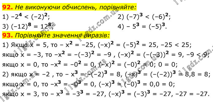 92. He виконуючи обчислень, порівняйте: 1) –24 < (–2)2; 3) (–12)8 = 128; 2) (–7)3 < (–6)2; 4) – 53 = (–5)3. 93. Порівняйте значення виразів: 1) Якщо х = 5, то – x2 = –25, (–х)2 = (–5)2 = 25, –25 < 25; якщо х = –3, то –x2 = –(–3)2 = –9 , (–х)2 = (–(–3))2 = 9, –9 < 9; якщо х = 0, то –x2 = –02 = 0, (–х)2 = (–0)2 = 0; 0 = 0; 2) якщо х = –2 , то – x3 = –(–2)3 = 8, (–х)3 = (–(–2))3 = 8,8 = 8; якщо х = 0, то –х3 = –03 = 0, (–х)3 = (–0)3 = 0,0 = 0; якщо х = 3, то – x3 = –33 = –27, (–х)3 = (–3)3 = –27, –27 = –27.