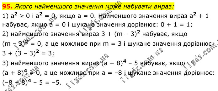 Якого найменшого значення може набувати вираз: 1) а2 ≥ 0 і а2 = 0, якщо а = 0. Найменшого значення вираз а2 + 1 набуває, якщо а = 0 і шукане значення дорівнює: 0 + 1 = 1; 2) найменшого значення вираз 3 + (m – 3)2 набуває, якщо (m – 3)2 = 0, а це можливе при m = 3 і шукане значення дорівнює: 3 + (3 – 3)2 = 3; 3) найменшого значення вираз (а + 8)4 – 5 набуває, якщо (а + 8)4 = 0, а це можливе при а = –8 і шукане значення дорівнює: (–8 + 8)4 – 5 = –5.