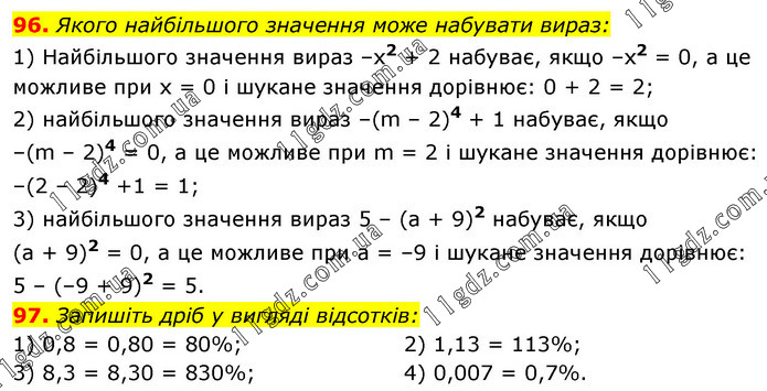 96. Якого найбільшого значення може набувати вираз: 1) Найбільшого значення вираз –х2 + 2 набуває, якщо –х2 = 0, а це можливе при х = 0 і шукане значення дорівнює: 0 + 2 = 2; 2) найбільшого значення вираз –(m – 2)4 + 1 набуває, якщо –(m – 2)4 = 0, а це можливе при m = 2 і шукане значення дорівнює: –(2 – 2)4 +1 = 1; 3) найбільшого значення вираз 5 – (а + 9)2 набуває, якщо (а + 9)2 = 0, а це можливе при а = –9 і шукане значення дорівнює: 5 – (–9 + 9)2 = 5. 97. Запишіть дріб у вигляді відсотків: 1) 0,8 = 0,80 = 80%; 3) 8,3 = 8,30 = 830%; 2) 1,13 = 113%; 4) 0,007 = 0,7%.