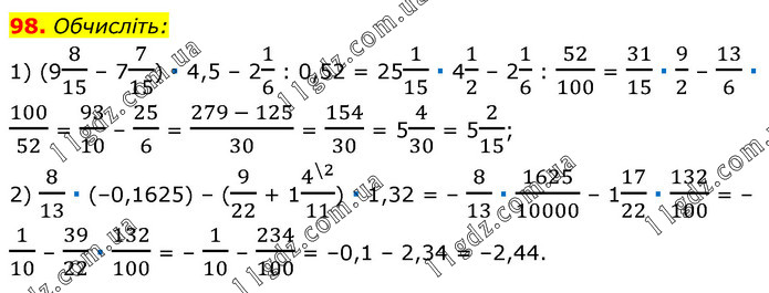 Обчисліть: 1) (98/15 – 77/15) ∙ 4,5 – 21/6 : 0,52 = 251/15 ∙ 41/2 – 21/6 : 52/100 = 31/15 ∙ 9/2 – 13/6 ∙ 100/52 = 93/10 – 25/6 = (279 - 125)/30 = 154/30 = 54/30 = 52/15; 2) 8/13 ∙ (–0,1625) – (9/22 + 14^(\2)/11) ∙ 1,32 = – 8/13 ∙ 1625/10000 – 117/22 ∙ 132/100 = – 1/10 – 39/22 ∙ 132/100 = – 1/10 – 234/100 = –0,1 – 2,34 = –2,44.