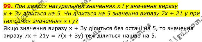 При деяких натуральних значеннях х і у значення виразу х + Зу ділиться на 5. Чи ділиться на 5 значення виразу 7x + 21 у при тих самих значеннях х і у? Якщо значення виразу х + Зу ділиться без остачі на 5, то значення виразу 7x + 21y = 7(х + Зу) теж ділиться націло на 5.