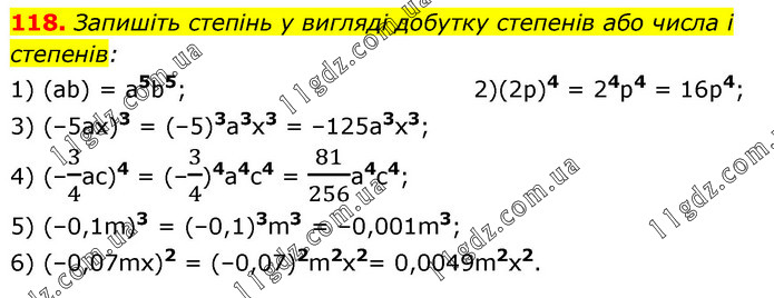 Запишіть степінь у вигляді добутку степенів або числа і степенів: 1) (ab) = a5b5; 3) (–5ax)3 = (–5)3a3x3 = –125a3x3; 2)(2р)4 = 24р4 = 16р4; 4) (–3/4ac)4 = (–3/4)4a4c4 = 81/256a4c4; 5) (–0,1m)3 = (–0,1)3m3 = –0,001m3; 6) (–0,07mx)2 = (–0,07)2m2x2= 0,0049m2x2.