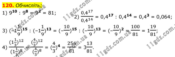 Обчисліть: 1) 910 : 98 = 92 = 81; 2) (0,4^17)/(0,4^14 ) = 0,417 : 0,414 = 0,43 = 0,064; 3) (–11/9)15 : (–11/9)13 = (–10/9)15 : (–10/9)13 = (–10/9)2 = 100/81 = 119/81; 4) ((1 1/3 )^12)/((1 1/3 )^8 ) = ((4/3 )^12)/((4/3 )^8 ) = (4/3)4 = 256/81 = 313/81.