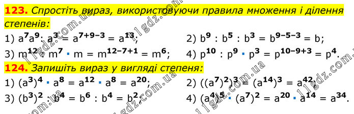 123. Спростіть вираз, використовуючи правила множення і ділення степенів: 1) a7a9: a3 = a7+9–3 = a13; 3) m12 : m7 ∙ m = m12–7+1 = m6; 2) b9 : b5 : b3 = b9–5–3 = b; 4) p10 : p9 ∙ p3 = p10–9+3 = p4. 124. Запишіть вираз у вигляді степеня: 1) (a3)4 ∙ a8 = a12 ∙ a8 = a20; 3) (b3)2 : b4 = b6 : b4 = b2; 2) ((a7)2)3 = (a14)3 = a42; 4) (a4)5 ∙ (a7)2 = a20 ∙ a14 = a34.