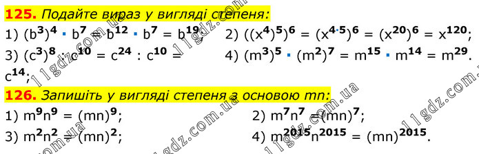 125. Подайте вираз у вигляді степеня: 1) (b3)4 ∙ b7 = b12 ∙ b7 = b19; 3) (c3)8 : c10 = c24 : c10 = c14; 2) ((x4)5)6 = (x4∙5)6 = (x20)6 = x120; 4) (m3)5 ∙ (m2)7 = m15 ∙ m14 = m29. 126. Запишіть у вигляді степеня з основою mn: 1) m9n9 = (mn)9; 3) m2n2 = (mn)2; 2) m7n7 =(mn)7; 4) m2015n2015 = (mn)2015.