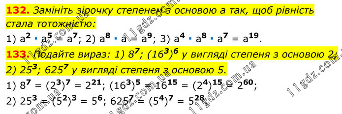 132. Замініть зірочку степенем з основою а так, щоб рівність стала тотожністю: 1) a2 ∙ a5 = а7; 2) а8 ∙ а = а9; 3) а4 ∙ а8 ∙ а7 = а19. 133. Подайте вираз: 1) 87; (163)6 у вигляді степеня з основою 2; 2) 253; 6257 у вигляді степеня з основою 5. 1) 87 = (23)7 = 221; (163)5 = 1615 = (24)15 = 260; 2) 253 = (52)3 = 56; 6257 = (54)7 = 528.