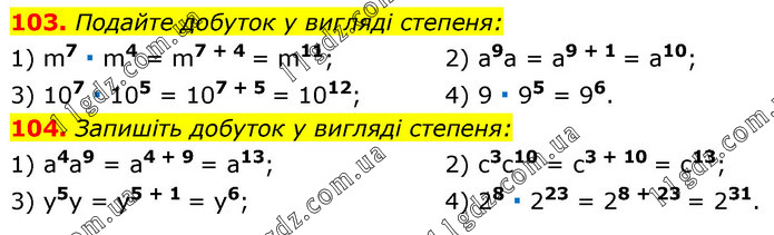 103. Подайте добуток у вигляді степеня: 1) m7 ∙ m4 = m7 + 4 = m11; 3) 107 ∙ 105 = 107 + 5 = 1012; 2) а9а = а9 + 1 = a10; 4) 9 ∙ 95 = 96. 104. Запишіть добуток у вигляді степеня: 1) а4а9 = а4 + 9 = a13; 3) у5у = у5 + 1 = y6; 2) c3c10 = c3 + 10 = с13; 4) 28 ∙ 223 = 28 + 23 = 231.