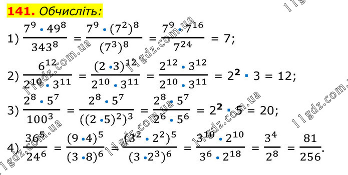 Обчисліть: 1) (7^9 • 49^8)/343^8 = (7^9 • (7^2 )^8 )/((7^3 )^8 ) = (7^9 • 7^16)/7^24 = 7; 2) 6^12/(2^10 • 3^11 ) = 〖(2 •3)〗^12/(2^10 • 3^11 ) = (2^12 • 3^12)/(2^10 • 3^11 ) = 22 ∙ 3 = 12; 3) (2^8 • 5^7)/(100^3 ) = (2^8 • 5^7)/(〖((2 •5)〗^2 )^3 ) = (2^8 • 5^7)/(2^6 • 5^6 ) = 22 ∙ 5 = 20; 4) 36^5/( 24^6 ) = 〖(9 •4)〗^5/〖(3 •8)〗^6 = (〖(3〗^2 • 2^2 )^5)/(〖(3 •2〗^3 )^6 ) = (3^10 • 2^10)/(3^6 • 2^18 ) = (3^4 )/2^8 = 81/256.