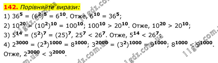 Порівняйте вирази: 1) 365 = (62)5 = 610. Отже, 610 = 365; 2) 1020 = (102)10 = 10010; 10010 > 2010. Отже, 1020 > 2010; 3) 514 = (52)7 = (25)7, 257 < 267. Отже, 514 < 267; 4) 23000 = (23)1000 = 81000; 32000 = (32)1000 = 91000; 81000 < 91000. Отже, 23000 < 32000.