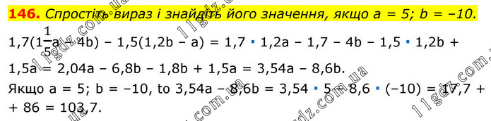Спростіть вираз і знайдіть його значення, якщо а = 5; b = –10. 1,7(11/5a – 4b) – 1,5(1,2b – a) = 1,7 ∙ 1,2a – 1,7 – 4b – 1,5 ∙ 1,2b + 1,5a = 2,04a – 6,8b – 1,8b + 1,5a = 3,54a – 8,6b. Якщо a = 5; b = –10, to 3,54a – 8,6b = 3,54 ∙ 5 – 8,6 ∙ (–10) = 17,7 + + 86 = 103,7.