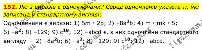Які з виразів є одночленами? Серед одночленів укажіть ті, які записано у стандартному вигляді: Одночленами є вирази: 1) 5m ∙ 2р; 2) –8а2b; 4) m ∙ mk ∙ 5; 6) –а2; 8) –129; 9) с18; 12) –abcd є, з них одночлени стандартного вигляду — 2) –8а2b; 6) –а2; 8) –129; 9) с18; 12) –abcd.
