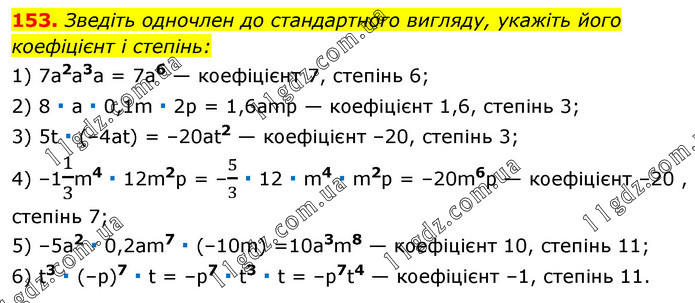 Зведіть одночлен до стандартного вигляду, укажіть його коефіцієнт і степінь: 1) 7а2а3а = 7а6 — коефіцієнт 7, степінь 6; 2) 8 ∙ а ∙ 0,1m ∙ 2р = 1,6amp — коефіцієнт 1,6, степінь 3; 3) 5t ∙ (–4at) = –20at2 — коефіцієнт –20, степінь 3; 4) –11/3m4 ∙ 12m2р = –5/3 ∙ 12 ∙ m4 ∙ m2р = –20m6р — коефіцієнт –20 , степінь 7; 5) –5a2 ∙ 0,2am7 ∙ (–10m) =10a3m8 — коефіцієнт 10, степінь 11; 6) t3 ∙ (–р)7 ∙ t = –р7 ∙ t3 ∙ t = –р7t4 — коефіцієнт –1, степінь 11.